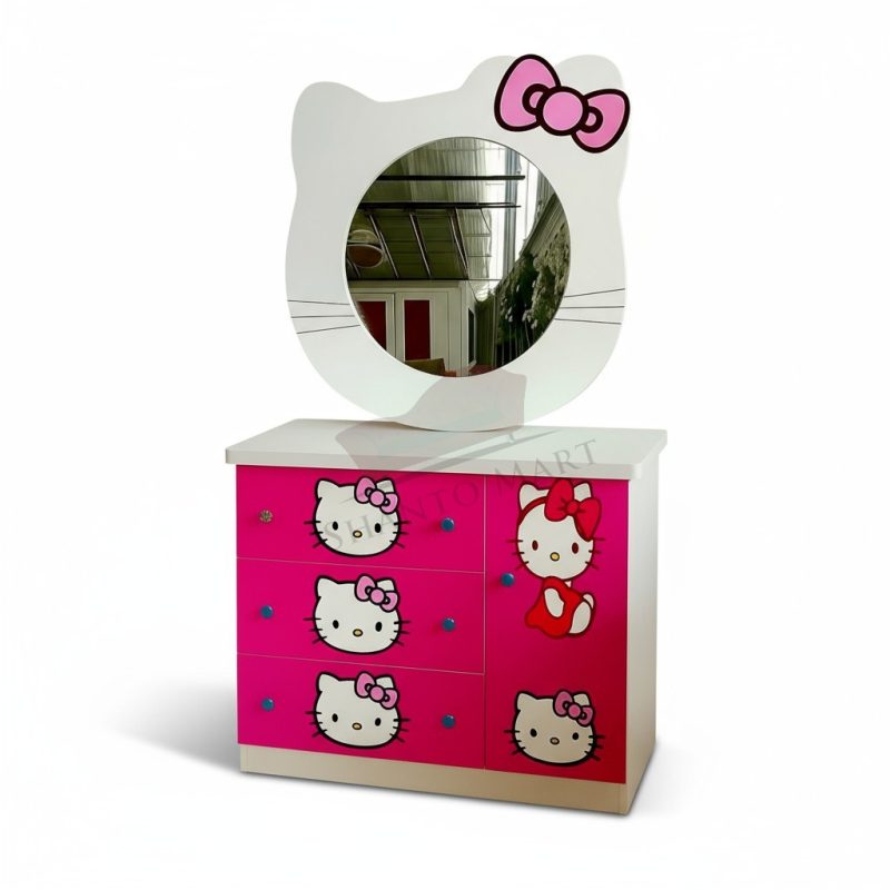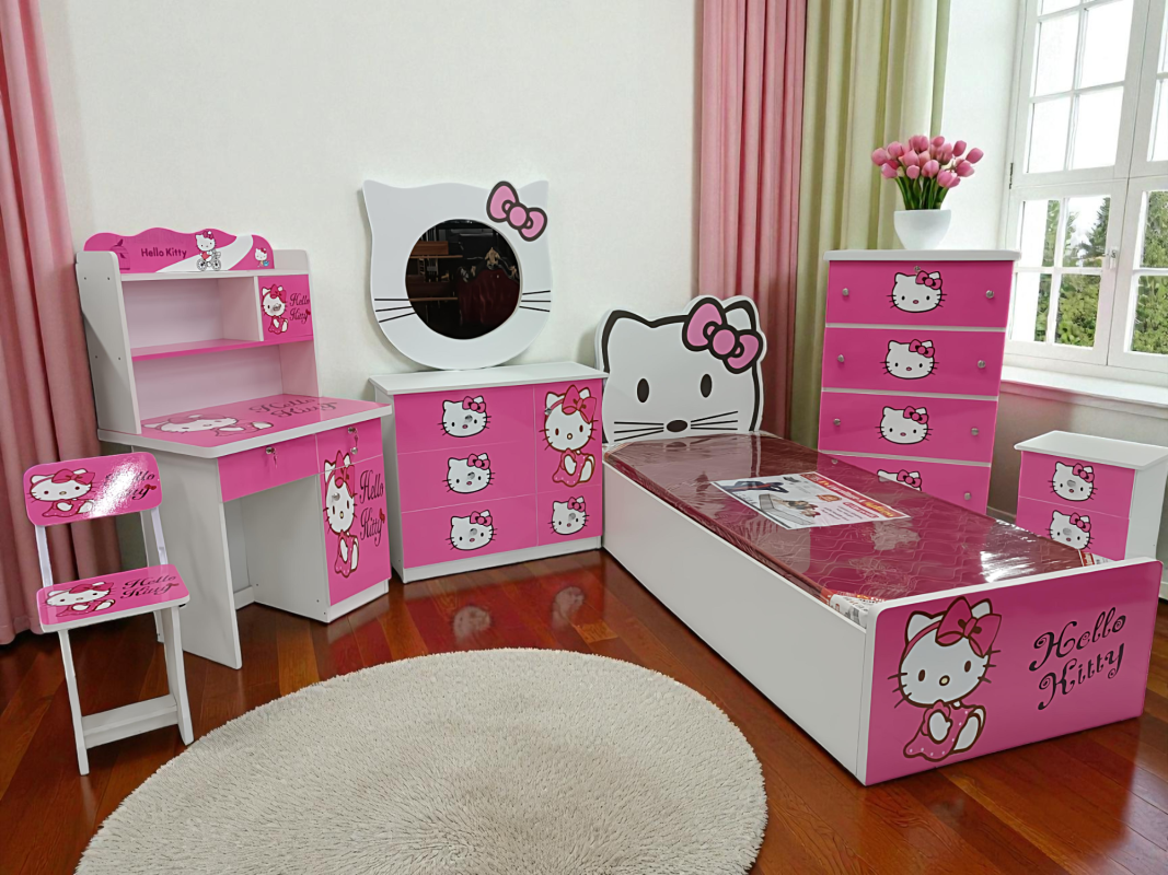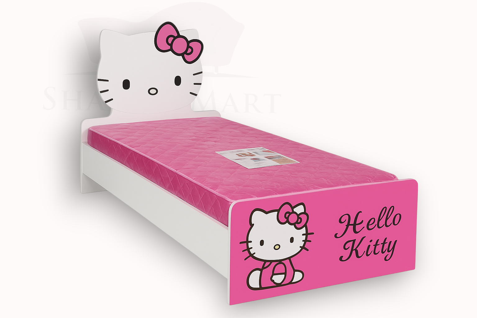 Charming and durable Hello Kitty kids’ bed designed to add fun, comfort, and elegance to your child’s room. Made with a solid mahogany wood frame, gorjon wood slats, and a gorjon ply base. The body is crafted from Malaysian wood with docco paint and inject finish, ensuring long-lasting quality and a premium look.